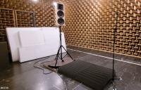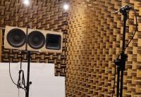 Verstärker Laptop und Soundkarte (und mich) habe ich hinter die Box hinter einer Wand aus Schaumstoff aufgebaut. Auf den Boden zwischen Lautsprecher und Mikrofon ist noch ein wenig Schaumstoff gekommen.