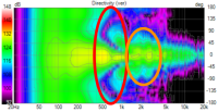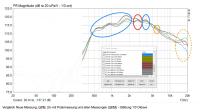 Hier sieht man die Reflexion vom Mic-Stativ am besten zwischen den eingekreisten Bereichen, zwischen ~6 und 13 kHz. Die GPM hat da einen relativ stetigen Verlauf, bei der Stativmessung ist ein konstantes auf und ab zu beobachten. Die Stärke der Welligkeit ist innerhalb des zu erwartenden Bereichs; siehe wiederum B&K Dokumentation zu Beginn der Threadseite - ca. +/- 0,5 dB; bzw. ich hab das mal bei mir nachgemessen, da lag's eher im Bereich +/- 1 dB.