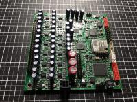 Auch auf dieser Platine sind fast alle Bauteile SMD, die einzigen bedrahteten Bauteile sind die Elektrolyt-Kondensatoren (die als SMD auch nicht deutlich kleiner wären), und die Anschlüsse (die ja auch eine gewisse Größe haben müssen, und von der zusätzlichen Stabilität durch die Löcher profiteren).