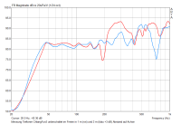 Leider konnte ich nicht wie im "alten" Filterdesigner TT- und HT-Kurven gemeinsam darstellen, daher einmal der Tieftöner und einmal der Hochtöner. Neben Equalizing der Chassis wurde jeweils mit 36 dB getrennt. Der Hochtöner mit Eckfrequenz bei 2,0 kHz und der Tieftöner bei 2,2 kHz (hier möchte ich ggf. noch etwas höher gehen).