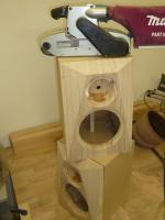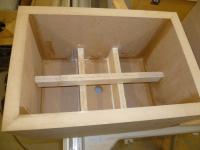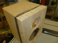 Habe die Streben nachträglich eingeleimt. Dabei gib es ja das Problem, dass man sie nicht wirklich press zwischen die Gehäusewände bekommt. Deshalb habe ich sie zweiteilig gemacht, mit 15° Schrägschnitt. Durch leichtes Verschieben auf der schiefen Ebene lassen sich hohe Kräfte erzielen. Eben wie mit einem Keil. Der flüssige Holzleim ist dabei ein gutes Schmiermittel.