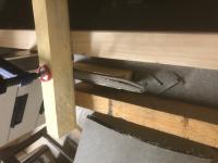 Wichtig ist auch, dass ihr anzeichnet, wie breit der Fräser läuft. (Mittellinie) Sonst kann es vorkommen, dass ihr die fixe Schablone abfräst. Es wäre doch schade die noch einmal bauen zu müssen! :doh: Damit die OF Schablone nach rechts und links frei laufen kann, habe ich unter die fixe Schablone noch den Abschnitt eines Sparrens gelegt. Ergonomisch ist es auch netter, wenn man sich nicht ständig bücken muss um die Position des Fräsers auf dem Werkstück zu prüfen.