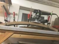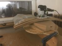 Okay... ich nutze erstmal 3 Brettchen Bauhöhe und will ein paar Bögen. Einen für die Fräse und einen fixierten. In der Mitte des OF-Bogens haben wir mehr als 3 Brettchen Gesamthöhe, also den fixierten Bogen bisschen abflachen, bis es passt. Natürlich alles mit der Stichsäge.
