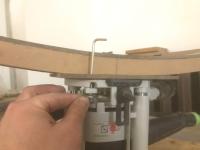 Die Fräse wird dann in der Mitte des OF-Bogens verschraubt. Ist die Bauhöhe des Bogens selbst zu groß, wird dann einfach ein Stück oben in der Mitte abgeschliffen und ein dünnes Multiplexbrett aufgeklebt. Darauf lässt sich dann die Fräse auf jeden Fall sicher fixieren.