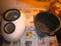 nimm Fliesenfugenmörtel und setze es als Paste zum Verstreichen an und trage es mit dem Pinsel auf, das sollte helfen ......... und die Farbenauswahl ist auch nicht uninteressant, vielleicht mit Farbschlieren oder Punkten, wenn schon Naturform dann von dort auch inspirieren lassen.