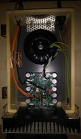 Der Boden der Holzkiste hat eine 3mm Aluminiumplatte (Recycling vom Metallverwerter) bekommen, das wäre sonst auch nicht stabil genug. Diese Platte und alle von Außen zugänglichen Metallteile (Lüftungsbleche, Kühlkörper) liegen auf Schutzleiter (wenn es fertig ist).