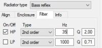 eingibst, bekommst du einen (aktiven) Hochpass 35Hz / 12dB mit 6dB Überhöhung bei der Filterfrequenz. Wenn der Bass auf - 6dB bei 35Hz abgestimmt ist, ergibt das in Summe einen glatten Frequenzgang bis 35Hz und dann geht es mit 6. Ordnung (4 BR + 2 Filter) in den Keller.