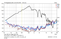 Im Amplitudenfrequenzgang zeigt sich nun starkes Bandpassverhalten mit starkem Einbruch im Bereich der angedachten Trennfrequenz. Das hat mich so gestört, dass ich diese Variante nicht weiter gemessen habe.