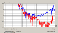 Abschließend zum Verzerrungsverhalten noch die Messung der Total Distortion (also THD und IMD und alles was sonst noch vorhanden ist). Diese wurden mit der Arta Multitonanregung mit angewandtem EIA-426B-Filter gemessen. Das Filter entspricht weitgehend der spektralen Verteilung von Musik. Daher lässt sich so eine Aussage über die im Betrieb wahrnehmbaren gesamten Verzerrungen, treffen.