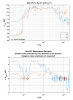 Vielleicht noch eine Abbildung, die sich aus der gewonnenen Kurvebschaar gewinnen lässt: der max. Pegel für einen bestimmten Verzerrungswert, hier für max. 3% K2 und 1% K3, die unten im oberen Diagramm gezeigt ist. Das untere Diagramm dient der Bewertung der Messung (wurde der Pegelwert gemessen? Wurde der Klirrwert erreicht?):
