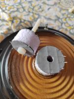 Ich hab das mal so gemacht. Lautsprecher mit weicher Sicke mit dem anderhalbfachen SD des Basstreibers genommen. Magnet abgeschnitten. In die Spule ein Kunststoffzylinder mit einer Kunststoffschraube in der Mitte eingeklebt zum Festklemmen von Scheiben mit Loch.