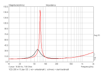 Prüfling war ein Rockwood YDD-200 in einem 15 Liter großen Testgehäuse. Das Spanplattengehäuse war komplett unbedämpft und die Impedanzmessung entsprach ziemlich exakt der Simulation (auch die Höhe der Imp-Spitze).
