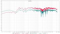 Die obere Kurven sind die Ausgangsspannung bei 1Veff am Verstärkerausgang mit und ohne Abschluß der Frequenzweiche (blau ist mit einem 4 Ohm Lautsprecher und rot ist ohne)