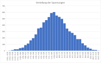 Die Verteilung der Spannungen ist eine fast mustergültige Normalverteilung. Die Verteilung der Leistungen zeigt, wie wenig die extremen Spitzenwerte auftreten. Das sagt ja auch der hohe Crest-Faktor aus.