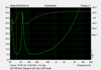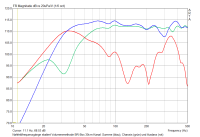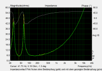 Gemessen habe ich jetzt auch schon mal Nahfeldfrequenzgänge (wieder flächenskaliert, weil für Volumenmethode zu tief abgestimmt) und Impedanzverlauf.