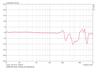 Jetzt werde ich mich mal der geplanten Abstimmfrequenz von knapp 40 Hz nähern und zudem kann ich mich der Resonanz bei 350 Hz widmen, die ziemlich exakt zur Gehäusetiefe und der Anordnung der inneren Öffnung des Reflexkanals passt...