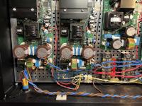 Ich habe es endlich geschafft weiter zu machen. Inzwischen ist die erste Version der Endstufe fertig. Sie besteht, wie geplant, aus 2x ICEpower 250ASX2 (zuständig jeweils für Hochtöner Li + Re und Mitteltöner Li + Re) sowie aus 2x ICEpower 125ASX2 (jeweils im BTL Mode zuständig für Tieftöner Li + Re).