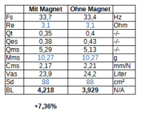 Ich hatte einfach die Impedanzverläufe mit "Fixed Mass Method" ausgewertet, um möglichst viele andere Parameter festzuzurren (Mms aus dem Datenblatt übernommen, und die Masse ändert sich ja beim selben Treiber nicht...)