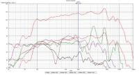 Messung war in 2m Abstand, das habe ich rausgerechnet. Die untere rote Linie ist die 3%-Marke (-30dB). Der steckte jetzt in einem Bastelgehäuse mit Mitteltontopf dahinter, Schallwand 26 x 110, auf Höhe 90 cm, 7 cm von der seitlichen Kante entfernt. Das kann also durchaus sein, dass die 108 dB bei 1 kHz eine kleine Schallwandüberhöhung sind.