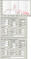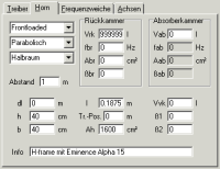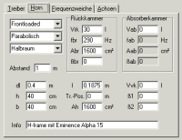 Aus dieser Kurve entnimmt man den Wert der Resonanz und setzt ihn als fbr in das Feld "Rückkammer" ein. Der Wert der Frontöffnung Ah gilt natürlich auch für die Reflexöffnung Abr der Rückkammer. Aus Ah und "l" des Fronthorns ergibt sich zwangsläufig das Volumen Vrk der Rückkammer.