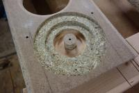 ein kleiner Schritt in Richtung Test-WG (siehe Post#80 für Details) ist getan. Wie in Post#75 beschrieben wurde die 3-Fache Fase des WG zuerst in Stufen aus der Schallwand gefräst: