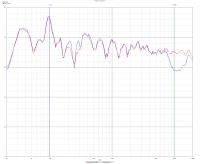 Blaue Kurve ist der Export aus Akabak, die grüne eine horizontale Linie zu Orientierung, rot die gemessene. Untenrum kommt dann der Raum mit rein. Oberhalb ca. 1 kHz hatte ich dann keine Möglichkeit mehr, mich an der blauen Kurve zu orientieren - die Simu wäre da eh nur noch eingeschränkt gültig - aber die Kurve ist auch in 3 m Entfernung noch so (nicht gezeigt). Insgesamt eine ganz minimal fallende Tendenz. Bei 500 Hz eine leichte Senke, bei 1 kHz eine leichte Überhöhung, da weiß ich nicht ob das vom Raum oder vom LS kommt. Ist mir leider zu spät aufgefallen, sonst hätte ich das verifiziert.