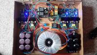 Verwendet wurde neben den Modulen ein 1000VA Trafo mit 2x36V Sekundär, zunächst 2 Siebplatinen mit je 60mF Siebkapazität, mittlerweile ist jedoch eine der beiden rausgeflogen, da es dabei Probleme gab. Dazu kommen noch 2 LS-Schutzschaltungen, sowie ein Softstart und ein DC-Filter, da der Trafo durchaus hörbar gebrummt hat. Ein Netzfilter ist ebenfalls vorhanden, der ist allerdings platzbedingt im Gehäuse der Vorstufe gelandet.
