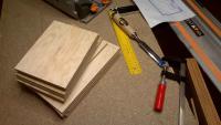In einer Hauruckaktion habe ich dann an Silvester den Rohbau der Boxen zusammengebaut (siehe Bilder). Mit Variera haben sie aber nur noch die gleichen Schallwandabmessungen und die leichte Neigung nach hinten gemeinsam. Alle anderen Winkel habe ich zugunsten eines einfachen Zusammenbaus geopfert (außerdem wäre das Volumen sonst nicht ausreichend groß geworden). Weiterhin ist die Box deutlich teifer als Variera. Neue Tiefe innen: 18 cm. Damit ist das Innenvolumen ist nun 6.21 Liter. Material ist 10er Kiefer-Multiplex.
