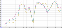 Dazu habe ich an meinem Hörplatz 320cm entfernt auf 100cm Höhe gemessen. Gelb ist hierbei das normale U-Frame (U ist nach hinten offen). Bei Grün sind die Seiten nach innen angewinkelt. Bei lila sind zur Seite geöffnet: