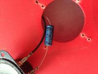 Ich habe dann das komplette Innenleben der Dose entsorgt und mir statt der Röhre einen 24" Samsung Flachbildfernseher gesucht und diesen über eine Aufhängung in die Dose an ein senkrechtes Brett gehängt. Dann noch einen kleinen Verstärker (Dynavox CS-PA1MK) mit 2x25 Watt Leistung eingebaut (ersetzte den Turm) und von Klinke (TV) auf Cinch (Verstärker) die Boxen aus den Türen verbunden.