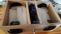 Verbaut wurden zwei Stück 3,3 Zoll FRS 8M 30W mit 8Ω. Hinter jedem der beiden Chassis sitzt jeweils eine Passivmembran zur Verstärkung der tiefen Frequenzen. Dazwischen habe ich die Räume mit Sonofil ausgefüllt. Der Amp ist ein TDA7492P mit 2x 50W. Angetrieben wird dieser von einem wiederaufladbaren Li-Ionen Akku mit 12V und 6800mAh (Hier habe ich einen externen Kippschalter parallel verlötet um diesen von außerhalb bedienen zu können). Als Baumaterial habe ich MDF-Holz genommen mit einer Dicke von 1cm, alles geleimt mit Ponal. Die Innenmaße der Box betragen in den Lautsprecherräumen 13cmx13cmx20cm jeweils und der mittlere Raum 6cmx13cmx20cm.