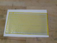 Dann wieder satt Brühe aufsprühen und ein Stück Kapton-Klebeband auflegen, klebende Seite zum Metall. Man kann das Kapton auf dem Wasserfilm dann noch etwas ausrichten. Dann die Oberseite einsprühen (dient als Schmiermittel) und die Brühe wieder rausrakeln.Es erfordert etwas Übung, bis man es komplett Blasenfrei hinbekommt. Aber wer schonmal Folien auf Autoscheiben aufgebracht hat...