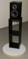 Habe gestern das schöne Wetter genutzt und mir auch einen Drehteller aus dem Pollin-Teil und einer 90x90 cm großen MDF-Platte gebastelt. Damit ich auch Standboxen drauf kriege, stützt eine zweckentfremdete Umlenkrolle für Stahlseile die drehbare MDF-Platte hinten ab. So oder so kann ich jetzt endlich problemlos 360°-Messungen machen, falls es mal nötig ist.