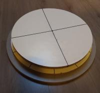Ich habe aktuell einen Ikea Holz Drehteller, auf dem in der Mitte eine Line aufgezeichnet ist, von der Strahlen in 5 - 10 - 15 - 30 - 45 Grad aufgezeichnet sind. Da der Teller zu klein ist, nimm ich einen Roten Holzbauklotz von meinem Enkelkind als Abstützung, der hat genau die richtige Höhe. Muss dann immer mitgeschoben werden beim drehen.