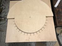 Eine Platte dient als Bodenplatte. Auf diese wird mittig der Drehkranz mit Senkkopfschrauben befestigt, nachdem man mit Hilfe eines Geodreiecks 10°-Striche über einen Halbkreis am Rand des Drehkranzes mit einem dicken Edding gezeichnet hat.