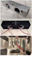 Das Gehäuse ist bis auf den Feinschliff und die fehlenden Schalter / Taster fertig. Passivmembranen sind eingeklebt und probehalber zwei 0815 Hochtöner verbaut die über 2.2 uF Kondensatoren laufen um das Setup erstmal in Gang zu bringen.