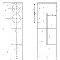 Bei dem rot markierten Objekt (Zeichnung unten) handelt es sich nicht um ein Brett mit zwei 50 mm-Öffnungen sondern das sollen drei Kanthölzer mit 50 mm Breite darstellen. Davon eines zwischen Schall- und Rückwand und zwei zwischen den Seitenwänden:
