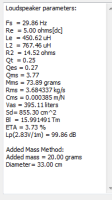 Die Software ist REW. Ich habe tatsächlich schon die TSP gemessen und zwar mit Limp, aber die originalen Daten würden mich trotzdem sehr interessieren. Und weil ich das zum ersten mal gemacht habe, weiß ich nicht, ob die Daten stimmen. Die 2 Chassis unterscheiden sich bei einigen Werten sehr stark voneinander.