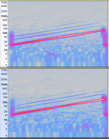 Ich habe noch mal mit den gleichen Pegeln im Nahfeld an der Membran gemessen. Direkter vergleich BR (oben) und Membran (unten) bei hohem Pegel: