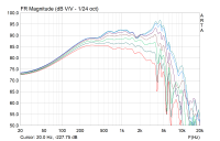 Nach der Abstinenz und anderen Projekten habe ich sie dann wieder aus der Ecke geholt und nochmal von vorn begonnen. Zumindest neue Messungen angefertigt und alle Simulationen gelöscht, um auf grüner Wiese wieder anzufangen. VituixCAD bietet neben der Ansicht des Achsfrequenzganges und dem Verhalten unter Winkeln auch die Möglichkeit, sich den "Energiefrequenzgang" ähnlich wie in BoxSim anzuzeigen. Und hier zeigte sich auch das Problem: im Mittelton wurde einfach unheimlich viel Energie in den Raum abgegeben.
