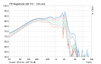 Als nächstes wurden Spielpartner gesucht. Für den Hoch- und Mittelton standen mehrere Treiber zur Auswahl. Im Hochton fiel die Wahl auf die von Peerless / Tymphany stammende Kalotte BC25TG15-04. Im Mittelton wollte ich zunächst ebenfalls eine Kalotte einsetzen und entsprechend wurde eine solche bestellt: Dayton RS52AN-8. Diese Dinger strahlen unheimlich breit ab und auch wenn vorhersehbar war, dass das eher nichts werden würde, wurde das gute Stück auf einer Testschallwand mit den angedachten Maßen gemessen. Ergebnis: stahlt zu breit ab, fiese Störungen die zum Großteil auf Schallwandeinflüsse zurückzuführen waren - kurz: das war mir nichts. Dayton's DC-Classic Serie bietet neben dem Tieftöner aber auch kleinere Chassis an - so zum Beispiel den DC130B-8, der sich optisch gut in das Bild fügte. Dieser misst sich so: