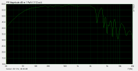 Wie wird man das los? Entweder mit einem abgestimmten Resonator (IRR, IHR) oder, was ich zuerst versuchen würde um die Ursache zu verifizieren: Einfach mal eine Platte Basotect in die Mitte der Box klemmen. Also auf voller Höhe in die Mitte zwischen Front und Rückwand, zwischen die beiden Noppenschaumplatten geklemmt. Das wird natürlich die Wirkung der PMs auf der Rückseite drunter leiden. Man kann dann optimieren und die Basoplatte solange kleiner machen bis die Resonanz gerade wieder sichtbar wird.
