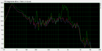 Eigentlich hätte ich auch selbst auf die Ursache kommen können. Man sieht es schön, wenn man die Messung vom leeren Gehäuse (rote Kurve) mit der bedämpften Variante (grüne Kurve) vergleicht. Im leeren Gehäuse ist die Resonanzspitze noch bei rund 600 Hz. Man sieht aber auch, dass der Pegel durch die Bedämpfung unter 200 Hz um ca. 1 dB abfällt.