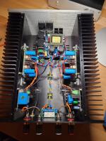 Die Besonderheit ist, das der Amp mit 100 mA Ruhestrom läuft als ClassAB, aber auch mit 1,2 A als ClassA betrieben werden kann. Das wird natürlich ordentlich Kühlung benötigen. Bei 100 mA sollte ein Kühlkörper von 0,9 K reichen. Die Leistung beträgt ca 60 Watt an 4 Ohm.Der Klang soll sehr ausgewogen, präzise, sein, Im Bassbereich nicht ganz so druckvoll wie beim Nächsten. Hier mehr Bilder und Daten https://www.diyaudio.com/community/threa...od.404507/