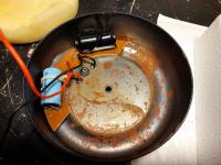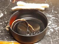 3. "Filzen": 2 Scheiben Filz mit je ca. 5mm Dicke eingelegt. Vorher natürlich noch die Kabel an die Terminals angelötet