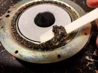 wie man evtl. auf den Bildern erkennen kann, müsste das Latex auch über die Schwingspulenzuleitung gepinselt werden, die angeklebt ist. Spiritus hat diesen Kleber m.E. nicht angegriffen.