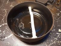 2. Dann die Dämmung des Topfs mit Terostatband getestet. Um die "Glockeneigenschaften" gut zu hören, habe ich den Blechtopf auf ein improvisiertes Ständerchen gelegt und mit dem Finger angestoßen. Die Schwingneigung war sehr ausgeprägt.