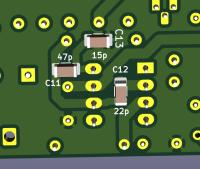 Vergessen...man kann für den 22pf SMD auch einen Glimmer Kondensator wie CY22-2 verwenden, der hat recht flexible Drähte, und auf die Pads löten. Wima haben doch zu starre Anschlüsse.