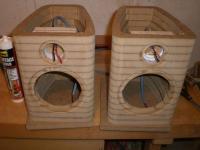 Innen habe ich nur mit einer Sticksäge ausgeschnitten. Insgesamt sind die Gehäuse aus je 16 Schichten 19mm MDF aufgebaut. 190mm breit, 220mm tief und 304mm hoch.