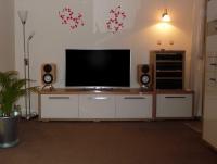 Oder ihn einfach unten in den Schrank verbannen ... Mit etwas Dämpfenden unter dem Sub und hinten einen Loch, das was rauskommt aus dem Schrank.